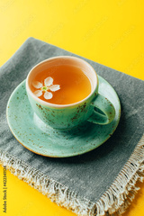 Turquoise cup of green or herbal tea on saucer with spring tree flowers on gray napkin over bright yellow background. Springtime concept. Vertical image.