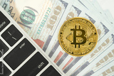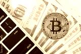 Golden Bitcoins coin and US banknotes with keyboard computer