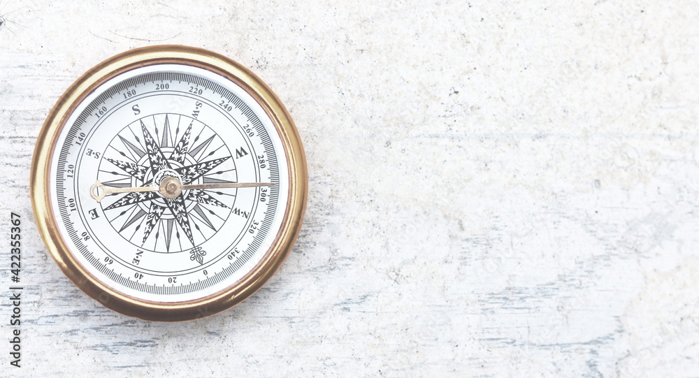 Classic navigation compass on natural background as symbol of tourism with compass, travel with compass and outdoor activities with compass