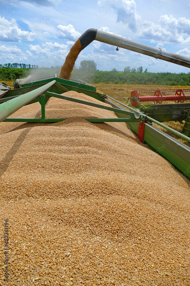 Combine harvester transferring freshly harvested wheat to tractor-trailer for transport, sky with clouds beautiful sunny day