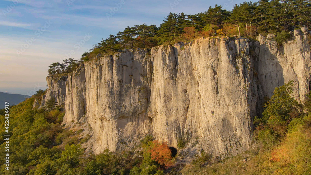 COPY SPACE: Drone view of an unrecognizable man rock climbing up a high cliff.