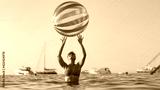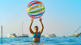 CLOSE UP: Young woman in bikini plays with huge inflatable ball on sunny evening