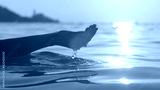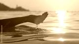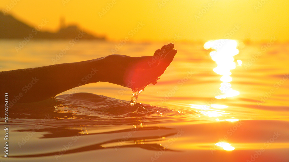 CLOSE UP: Golden sunset shines on woman's hand cupping a handful of sea water.