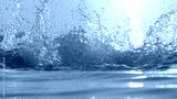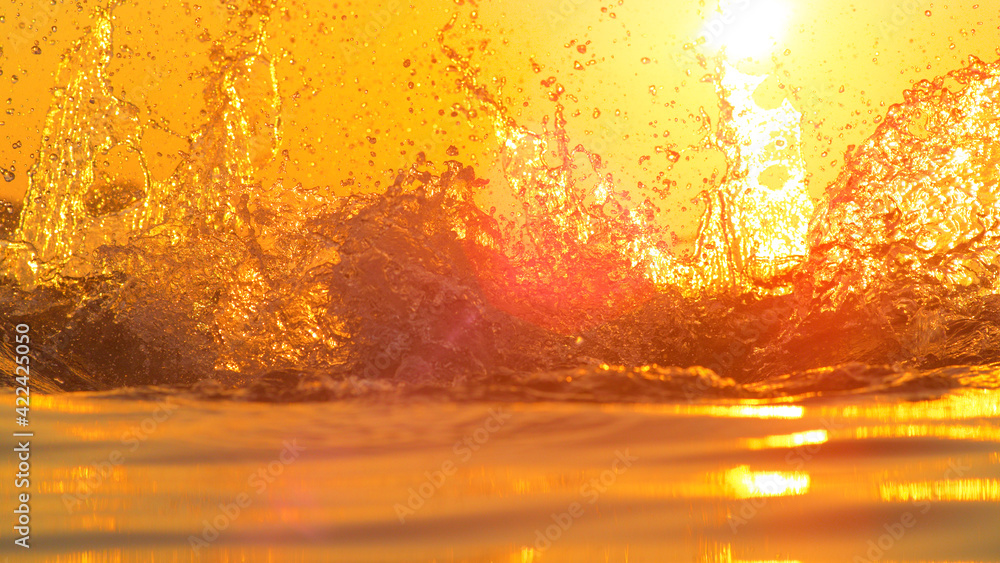 LENS FLARE: Detailed shot of glassy ocean water splashing into evening sky.