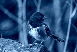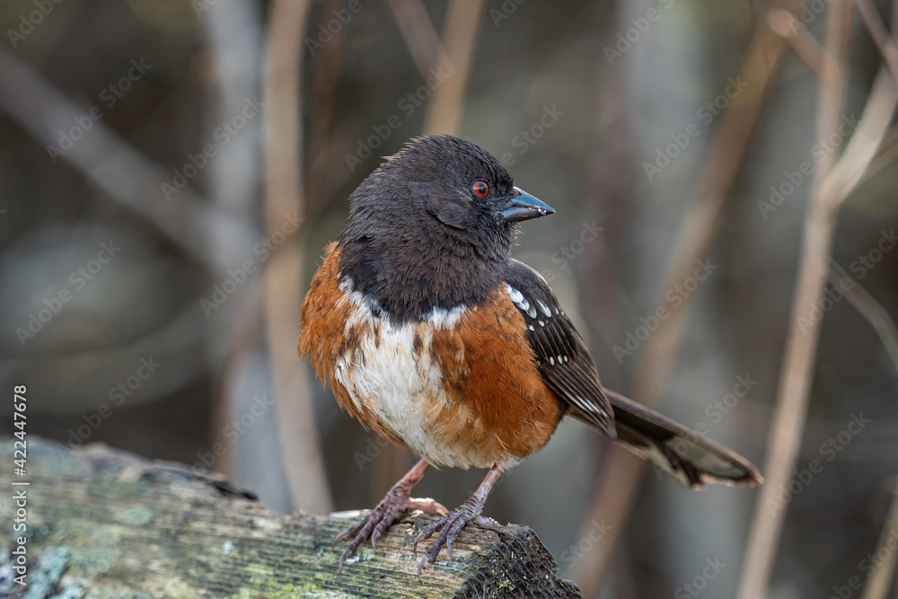 close up of a cute towhee bird resting on top of moss-covered wooden fence in the park