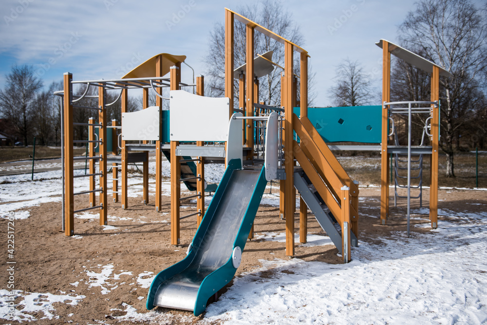 Children's playground covered with snow in winter