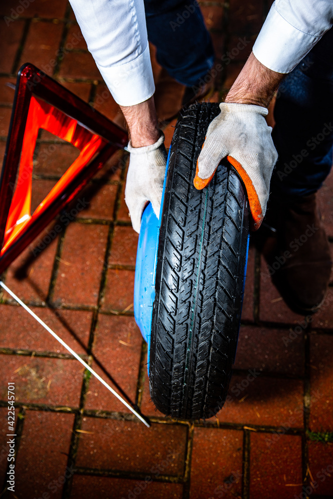 Vertical view of male hands holding a spare wheel, an emergency warning triangle in a background. Changing a car tyre at night.