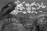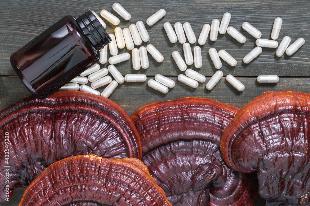 Ling zhi mushroom and capsule with bottle mockup