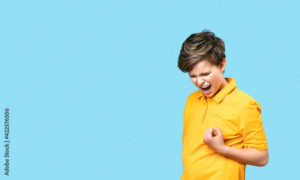 Caucasian teen school boy shouting with happiness on blue background. Strong emotions, winner. Achievement and success clenched fist gesture. Copy space banner. Accomplishment