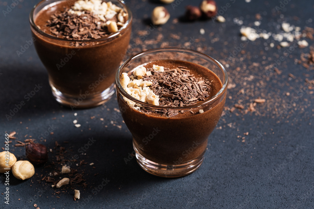 Homemade dark chocolate mousse with hazelnut in glasses on dark grey table