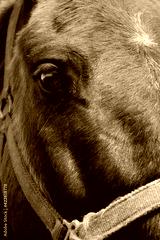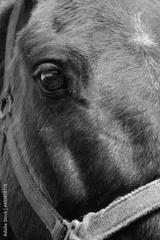 Very close capture of the eye of a brown meek horse in the farm
