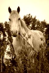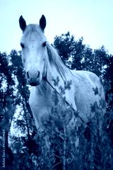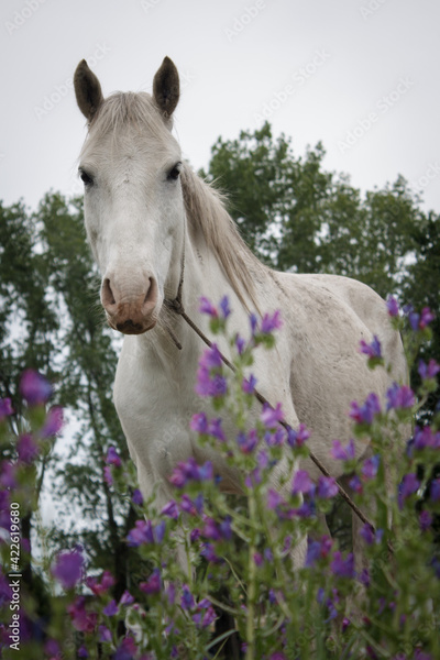 White horse seen from a close view surrounded with flowers in a cloudy day