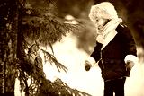 Little girl is meeting an owl in Russian forest in winter. Image with selective focus and toning