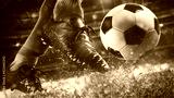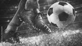 Football scene at night match with close up of a soccer shoe hitting the ball with power