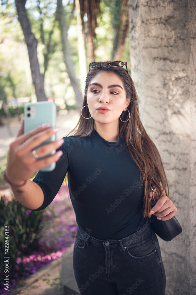 Relaxed happy woman in the park in summer climate. Portrait of a cute smiling woman outdoors. Concept of outdoor lifestyle. Latin girl power. Mexican young girl