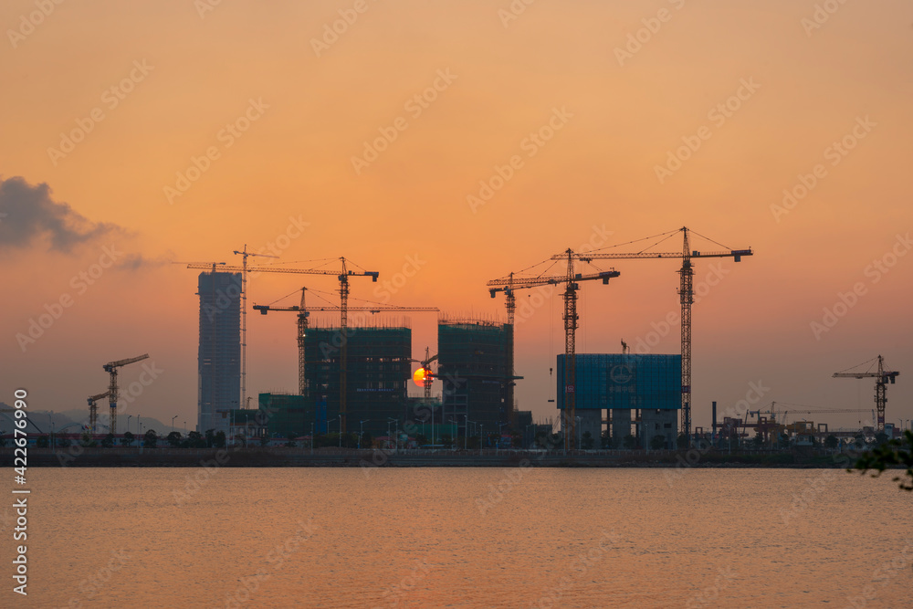 Construction of Hengqin at sunset, Zhuhai, Guangdong, China