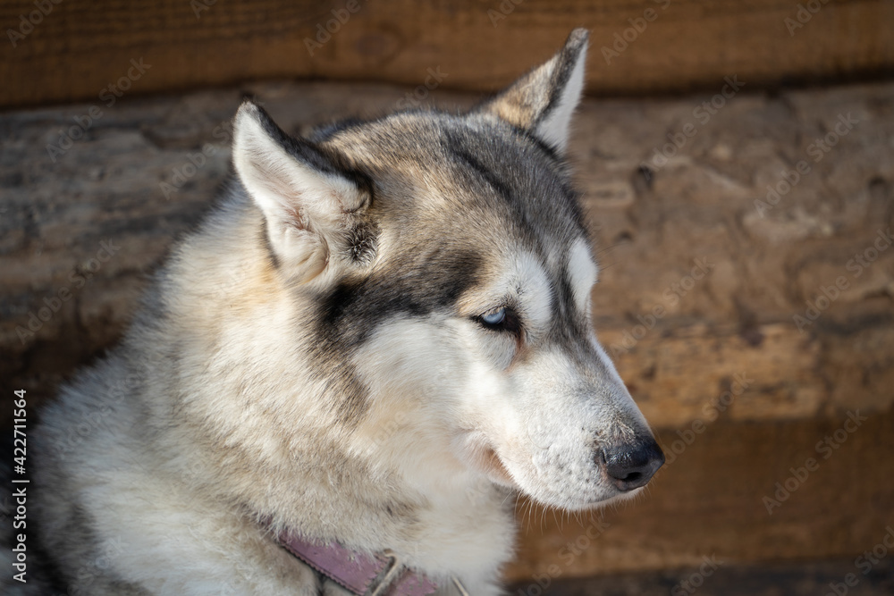 Close-up photo of a husky. Siberian Husky looks into the distance thoughtfully.