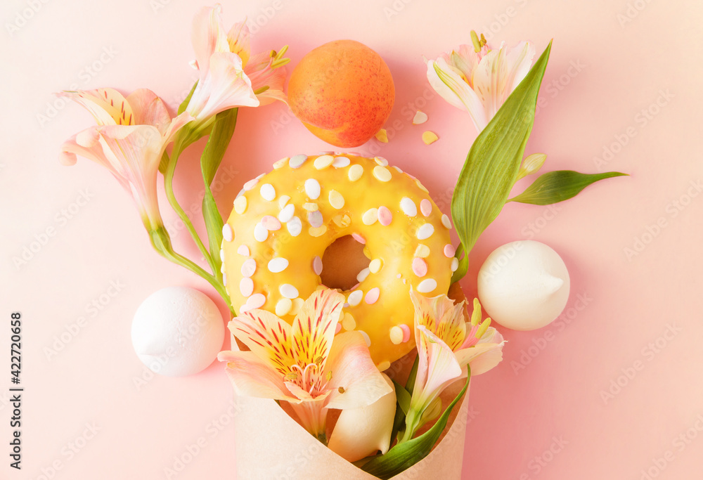 yellow donat and alstroemeria flowers, fresh apricots in a paper envelope