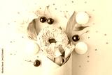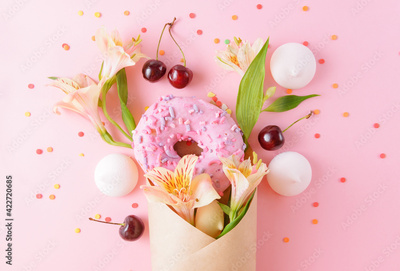 pink donat and fresh cherries, alstroemeria flowers in a paper envelope on a pink background
