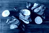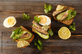 3 sandwiches with rye bread, sprats, fresh cucumber, boiled eggs and parsley, lime