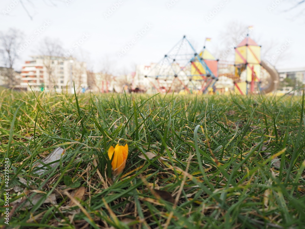 Żółty kwitek przybijający się przez zieloną trawę na tle placu zabaw, Wrocław