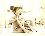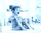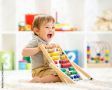 Little child boy playing with toy blocks. Baby in nursery or kindergarten