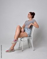 full length portrait of girl wearing shirt and denim shorts. sitting pose on chair, isolated on grey studio background.