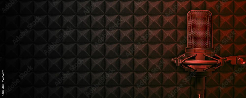 Recording studio microphone on acoustic foam background with red light, music production or broadcasting banner
