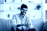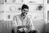 Checking new app. Happy arab man using smartphone, relaxing on comfy sofa at home interior