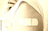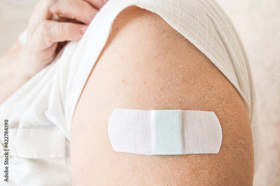 Hand with bandage. Vacctination. Medical plaster to the person after vaccination. Health care concept. Close-up