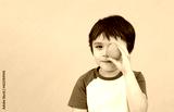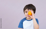 Portrait cute kid covering eyes with orange on purple background, Joyful boy holding orange and looking at camera with little smile,Kid making funny face with fruit with copy space