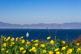 Landscape of yellow dandelions and a sea view with a boat at the coast of Majorca, Spain.