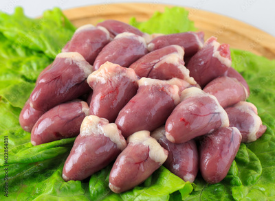 raw chicken hearts on white background