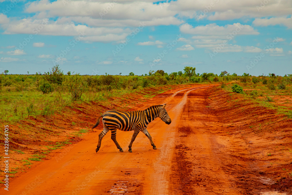 a zebra covered in red sand in Tsavo National Park crosses the road