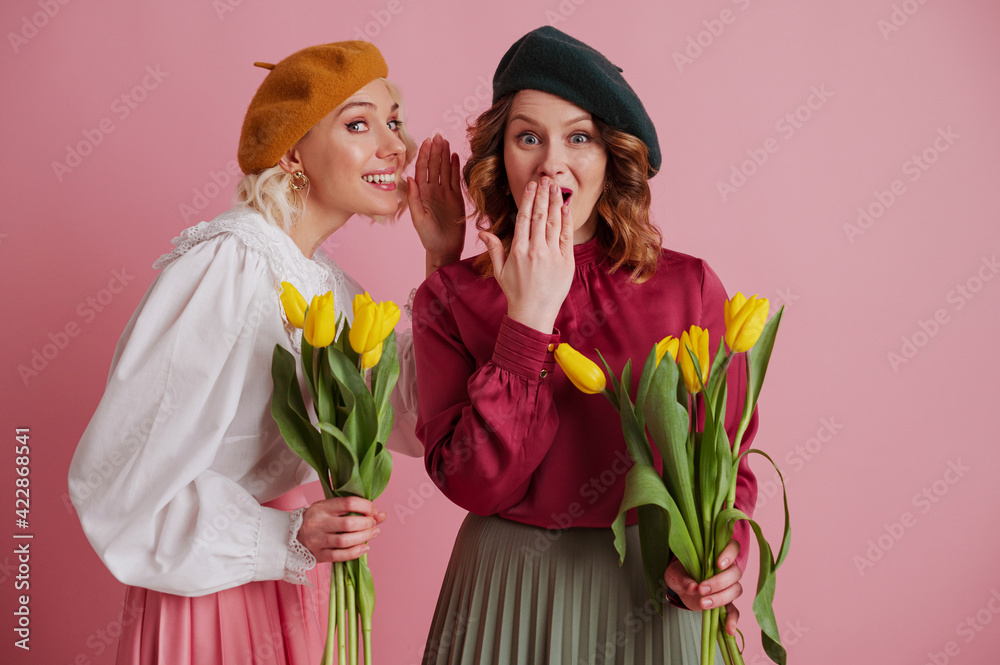 Fashionable woman talks a secret to her surprised friend. Models wearing stylish spring clothes, holding yellow tulips. Spring fashion, shopping, sale conceprion. Copy, empty space for text