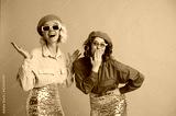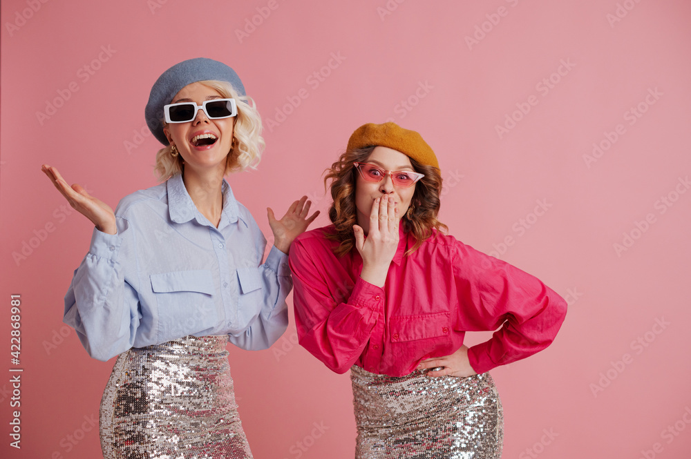 Happy smiling fashionable ladies wearing stylish colorful shirts, berets, sequin skirts, trendy sunglasses, posing on pink background. Spring fashion concept. Copy, empty space for text