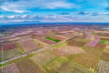 Orchard of peach trees bloomed in spring.Aerial shot with drone