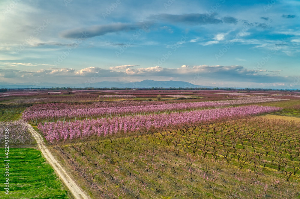 Orchard of peach trees bloomed in spring.Aerial shot with drone
