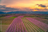 Orchard of peach trees bloomed in spring.Aerial shot with drone
