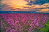 Orchard of peach trees bloomed in spring.Aerial shot with drone