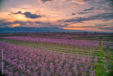 Orchard of peach trees bloomed in spring.Aerial shot with drone