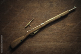Miniature rifle made of wood and brass on the table