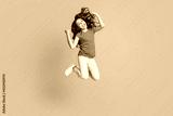 Full size photo of happy screaming excited crazy little girl jumping in victory success isolated on yellow color background
