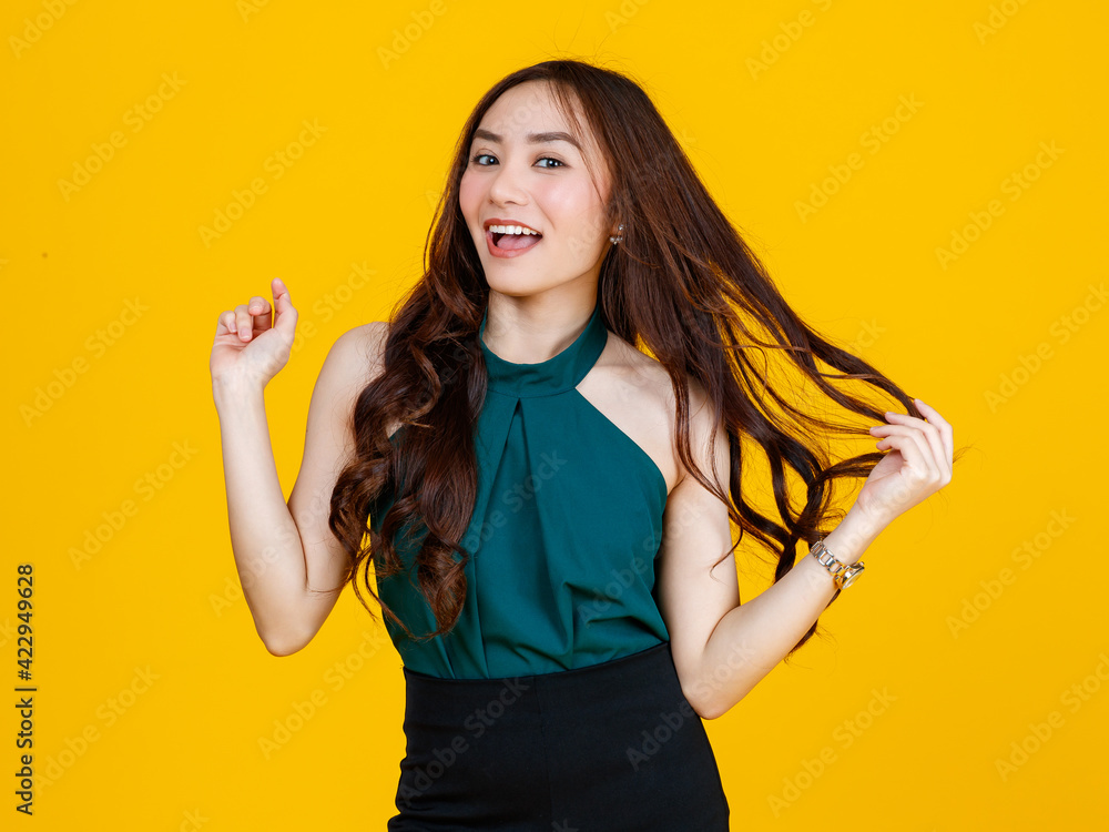30s cute and charming curly hair Asian female brunette pose to camera with a joyful and positive gesture for advertising use purpose. Taken with studio flash isolated on yellow background