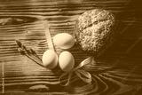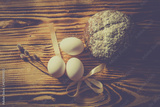 Postcard for the bright Easter holiday in retro style with white eggs and a budding willow and rye bread on a beige wooden background in dark tinting