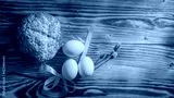 Easter composition in a simple style with white eggs, rye bread, a willow branch on a natural wooden background