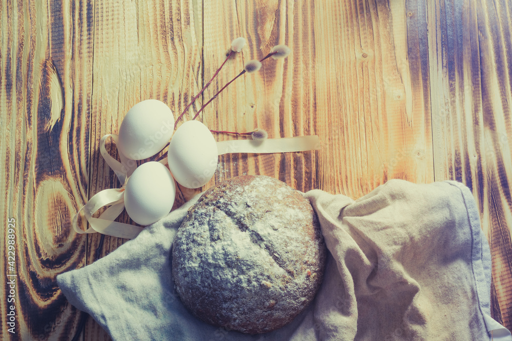 Postcard for the bright Easter holiday in retro style with white eggs and a budding willow and rye bread on a beige wooden background in dark tinting