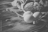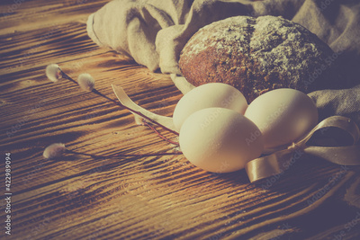 Easter composition in a simple style with white eggs, rye bread, a willow branch on a natural wooden background