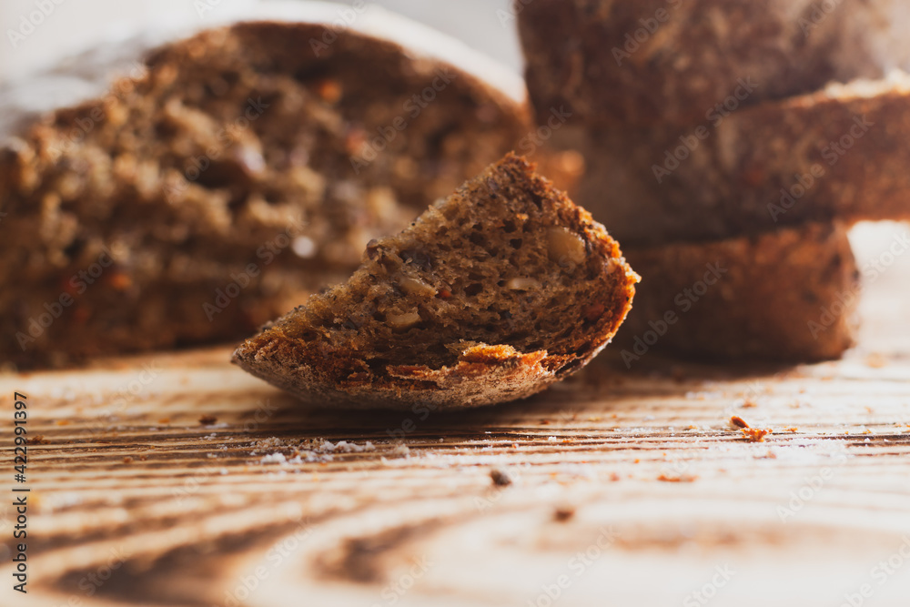 Round-shaped dark rye grain bread with sunflower seeds, carrot slices on a wooden natural background