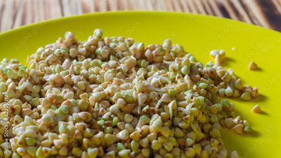Green buckwheat with sprouts on a yellow plate for proper dietary nutrition